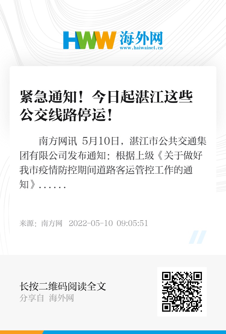 南方网讯 5月10日,湛江市公共交通集团有限公司发布通知:根据上级《关于做好我市疫情防控期间道路客运管控工作的通知》要求,为有效管控疫情传播扩散风险,从即日(5月10日)起,除部分途经铁路西客站的公交线路(6路、61K、62K、65K、66K、73路)正常运营之外,其余线路暂停运营,具体恢复时间将另行通知。如有不便,敬请谅解。