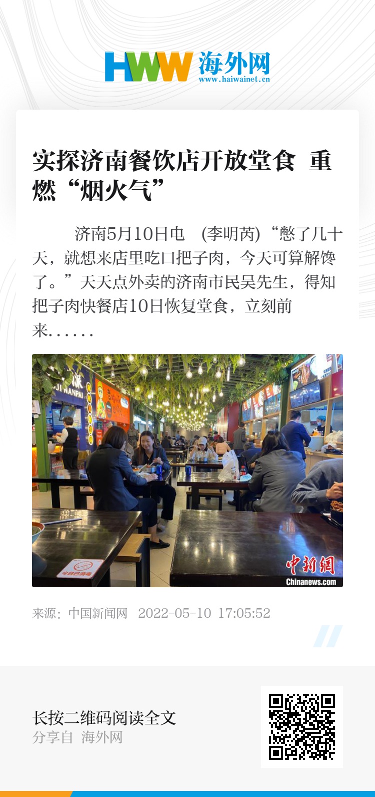 随着疫情形势出现积极信号,济南引导餐饮单位规范有序恢复堂食,自5月10日零时起,除历城区、济南高新区重点管控区域及全市其他封控区、管控区以外的区域,有序恢复餐饮(堂食)经营活动。