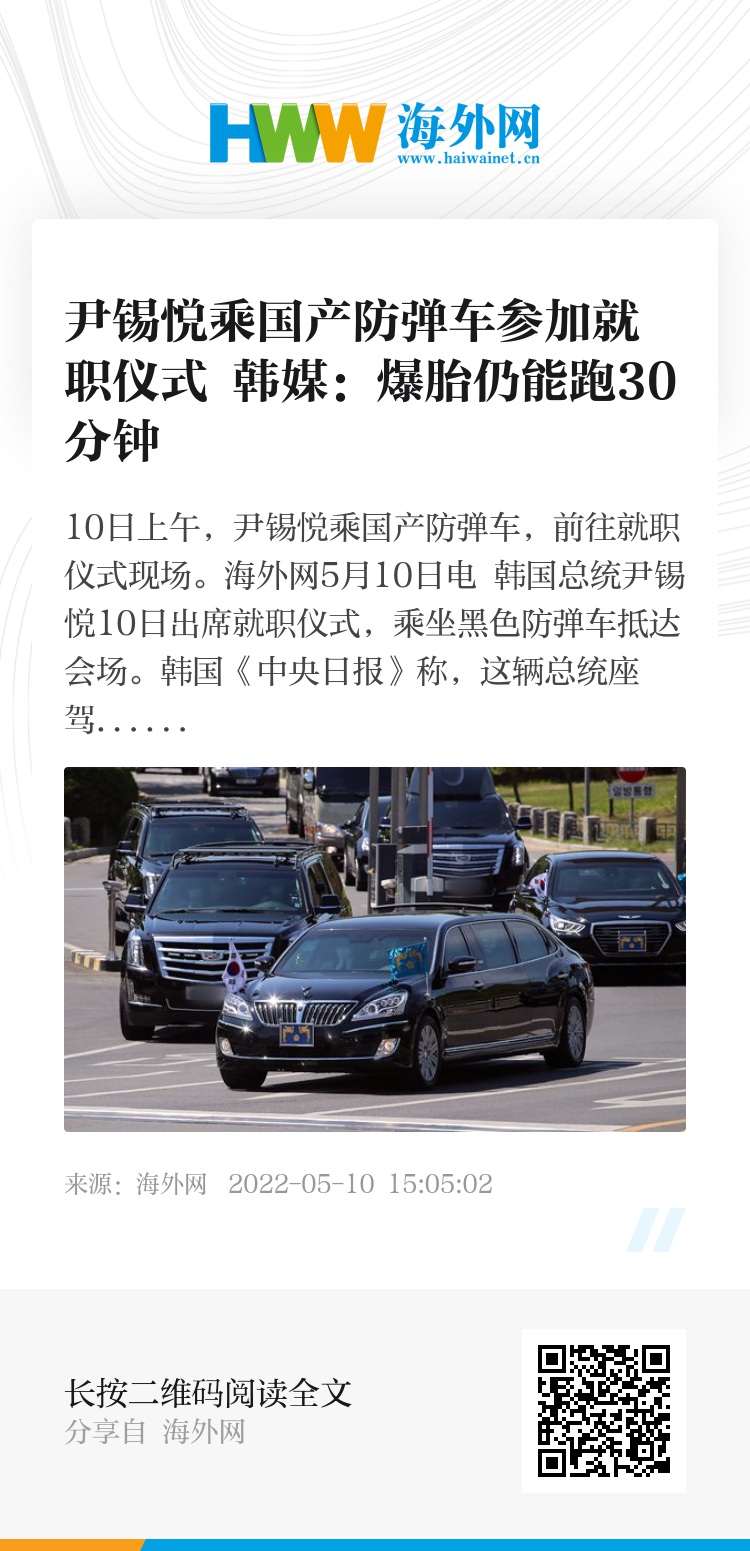 海外网5月10日电 韩国总统尹锡悦10日出席就职仪式,乘坐黑色防弹车抵达会场。韩国《中央日报》称,这辆总统座驾为韩国国产,爆胎后仍能行驶30分钟。