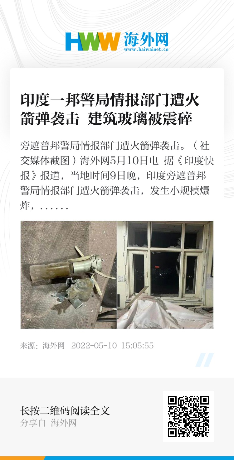 海外网5月10日电 据《印度快报》报道,当地时间9日晚,印度旁遮普邦警局情报部门遭火箭弹袭击,发生小规模爆炸,造成建筑玻璃被震碎。此次事件中无人伤亡。