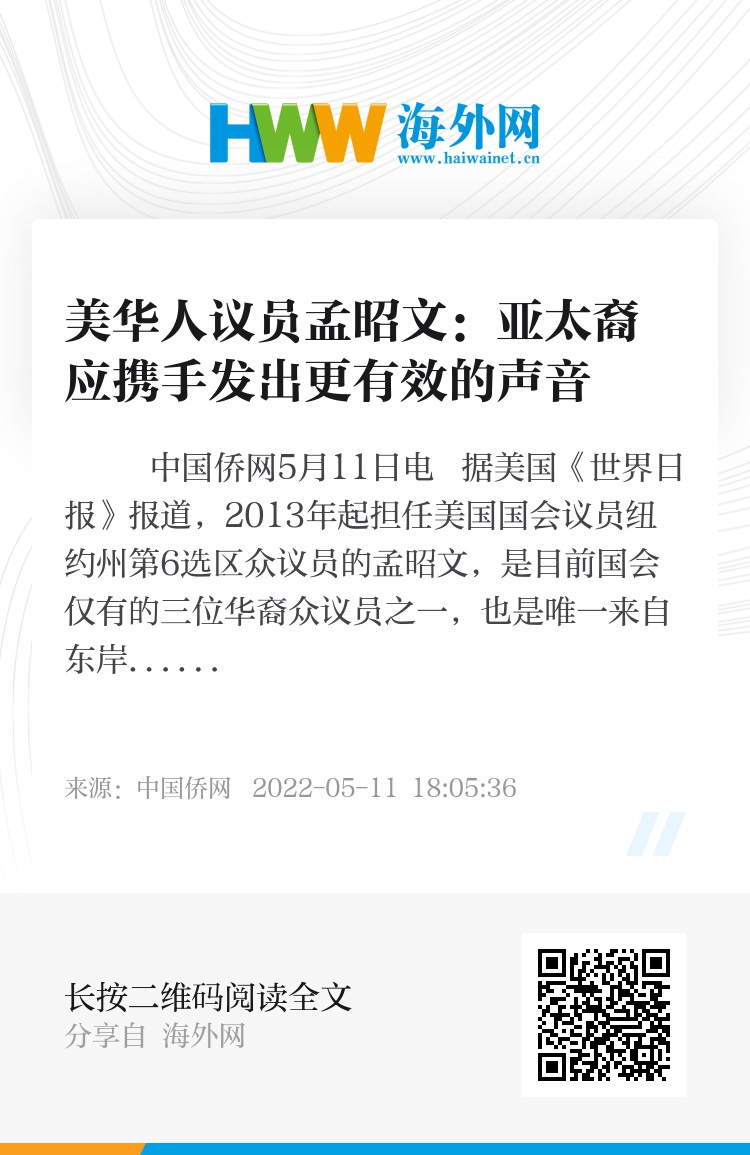 中国侨网5月11日电 据美国《世界日报》报道,2013年起担任美国国会议员纽约州第6选区众议员的孟昭文,是目前国会仅有的三位华裔众议员之一,也是唯一来自东岸的华裔众议员。她表示,亚太裔传统月对美国多元的亚裔社区非常重要,“通常我们父母一辈可能很难理解亚太裔传统月的意义,因为在他们的母国可能只有单一族裔,但是来到美国以后,亚太裔变得多元,让各种不同的亚太裔文化交织在一起、大家携手发出更大声更有效的声音十分重要。”