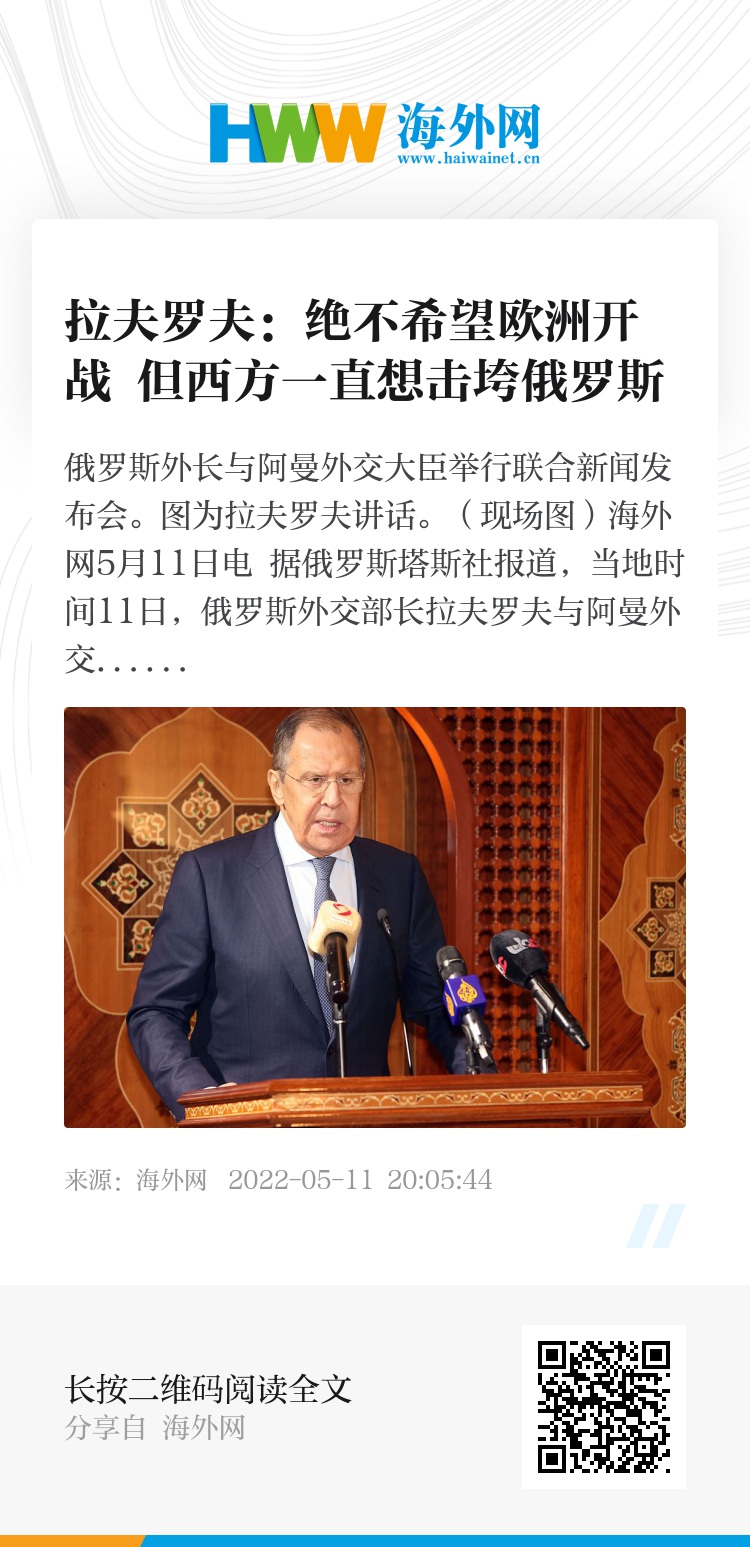 海外网5月11日电 据俄罗斯塔斯社报道,当地时间11日,俄罗斯外交部长拉夫罗夫与阿曼外交大臣巴德尔会谈后举行新闻发布会。拉夫罗夫表示,俄罗斯绝不希望欧洲开战,但西方一直想在乌克兰问题上击垮俄罗斯。