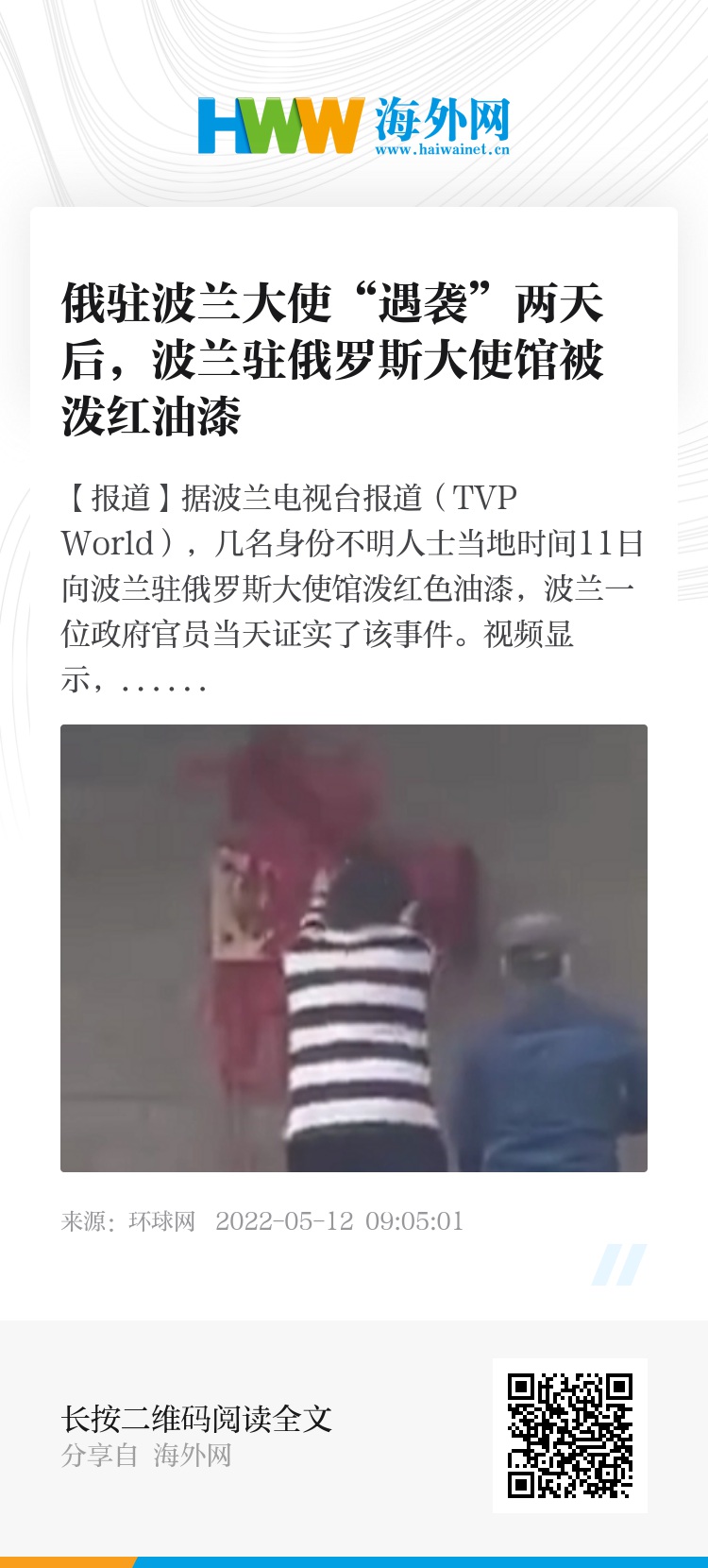 【环球网报道】据波兰电视台报道(TVP World),几名身份不明人士当地时间11日向波兰驻俄罗斯大使馆泼红色油漆,波兰一位政府官员当天证实了该事件。