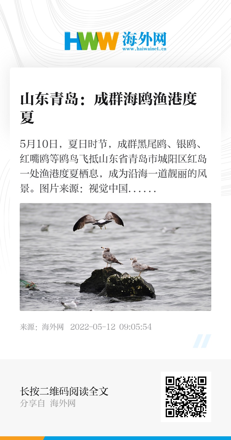 5月10日,夏日时节,成群黑尾鸥、银鸥、红嘴鸥等鸥鸟飞抵山东省青岛市城阳区红岛一处渔港度夏栖息,成为沿海一道靓丽的风景。