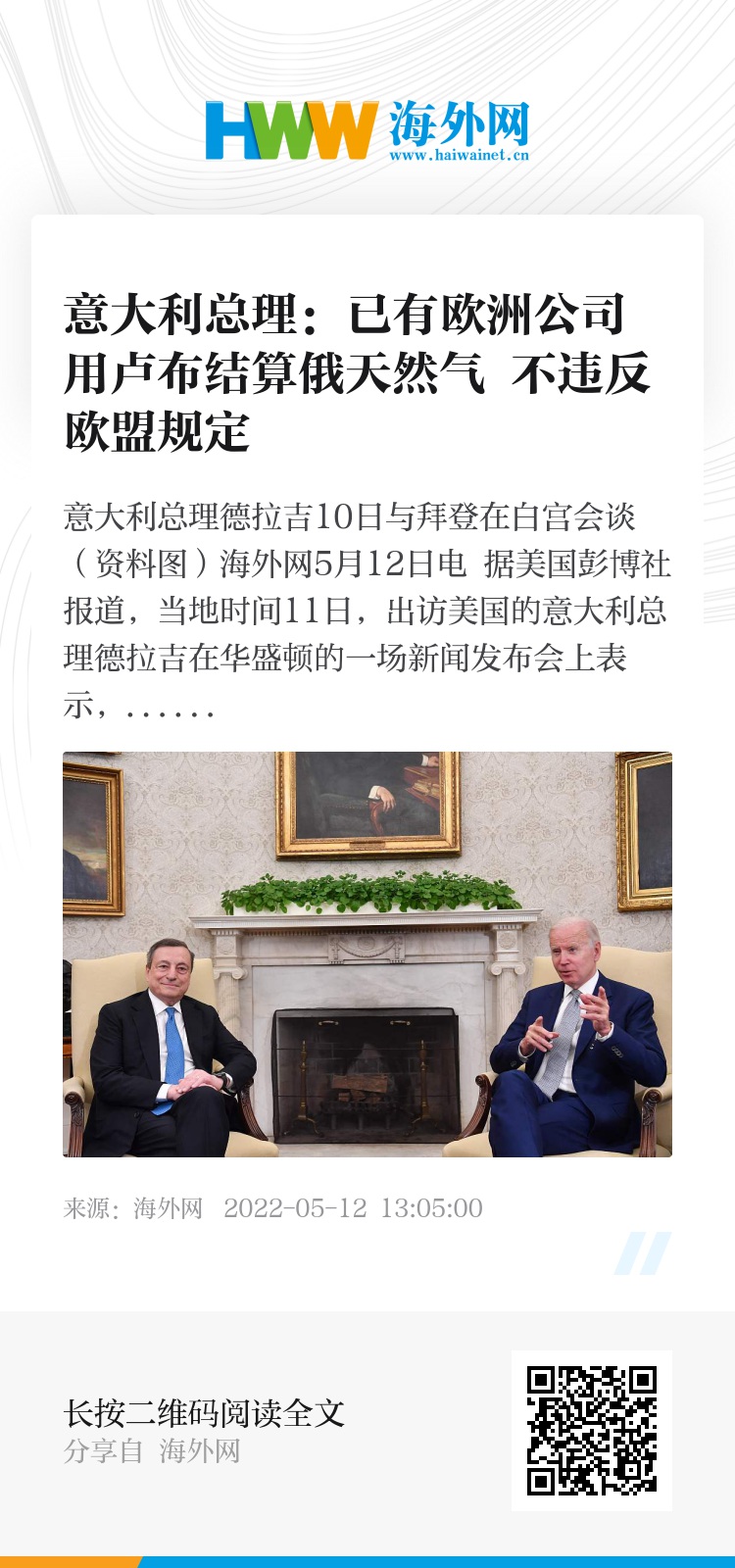 海外网5月12日电 据美国彭博社报道,当地时间11日,出访美国的意大利总理德拉吉在华盛顿的一场新闻发布会上表示,欧洲公司能够以俄罗斯货币卢布结算俄天然气,此举尚不违反制裁规定。