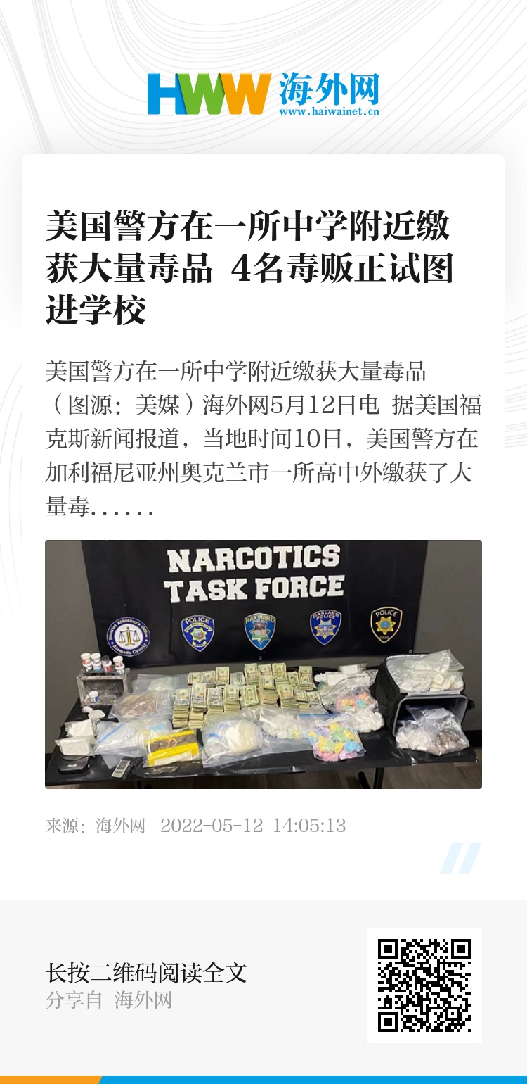 海外网5月12日电 据美国福克斯新闻报道,当地时间10日,美国警方在加利福尼亚州奥克兰市一所高中外缴获了大量毒品。