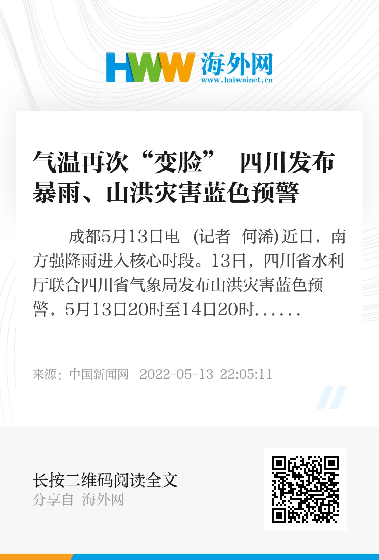中新网成都5月13日电 (记者 何浠)近日,南方强降雨进入核心时段。13日,四川省水利厅联合四川省气象局发布山洪灾害蓝色预警,5月13日20时至14日20时,四川西充、南部、盐亭、射洪、雁江、乐至、安岳、资中等县(市、区)可能发生山洪灾害。