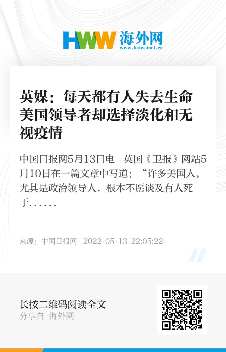 中国日报网5月13日电 英国《卫报》网站5月10日在一篇文章中写道:“许多美国人,尤其是政治领导人,根本不愿谈及有人死于新冠肺炎这件事,甚至想都不愿意去想。即便现在每天还在有人因新冠失去生命,他们也只想把疫情尽可能地抛到脑后。”