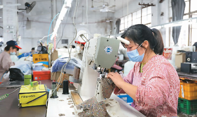 今年以来,江西省新余市分宜县就业创业服务中心通过落实失业保险阶段性减免、失业保险稳岗返还等优惠政策,帮助企业纾困稳岗。截至目前,已为282家企业减免失业保险157.98万元,落实失业保险稳岗返还68.67万元。图为5月11日,分宜县宏祥鞋厂工人在赶产品。