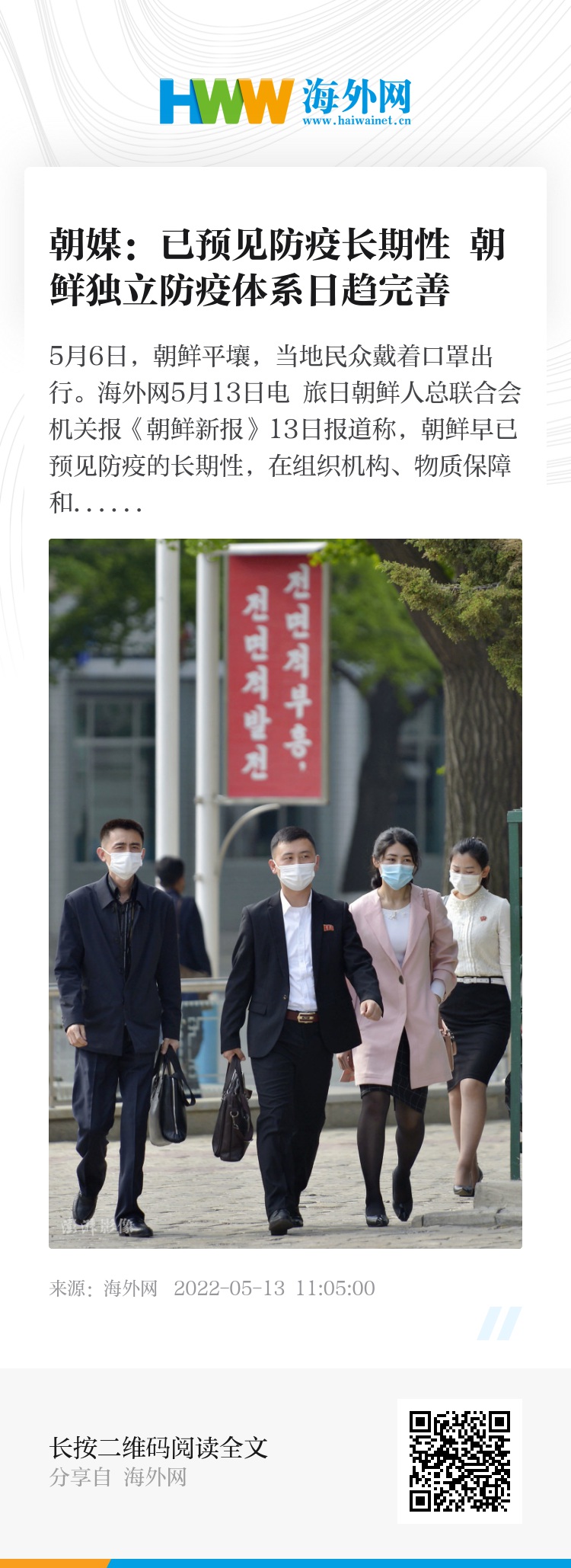 海外网5月13日电 旅日朝鲜人总联合会机关报《朝鲜新报》13日报道称,朝鲜早已预见防疫的长期性,在组织机构、物质保障和科学技术方面采取一贯应对措施,已充分具备加强防疫的能力,独立防疫体系更加完善。