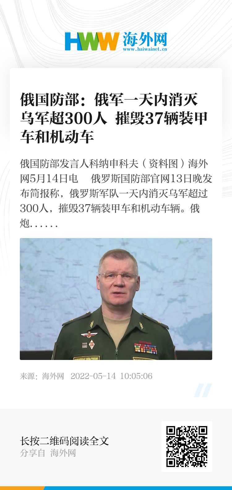 海外网5月14日电 俄罗斯国防部官网13日晚发布简报称,俄罗斯军队一天内消灭乌军超过300人,摧毁37辆装甲车和机动车辆。俄炮兵和火箭兵部队摧毁乌方17个指挥所、5个炮兵部队、370个有生力量及军事装备聚集区。