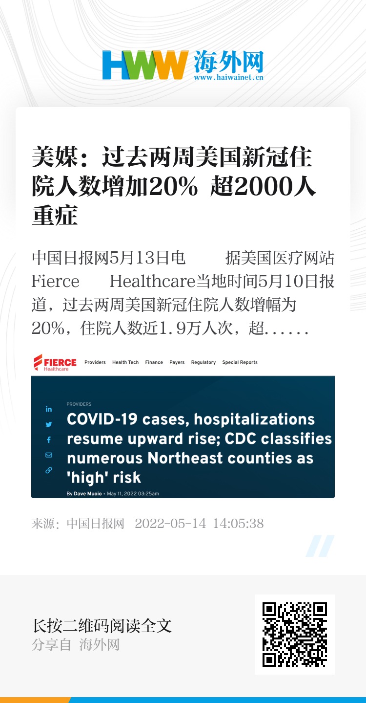 中国日报网5月13日电 据美国医疗网站Fierce Healthcare当地时间5月10日报道,过去两周美国新冠住院人数增幅为20%,住院人数近1.9万人次,超过2000人在重症病房。美国疾病控制与预防中心(CDC)近日公布的数据显示,截至5月8日,该国日新增病例数呈上升趋势,达到周平均66564例,近期该机构将美国东北部多个县的社区风险等级上升至中或高水平。