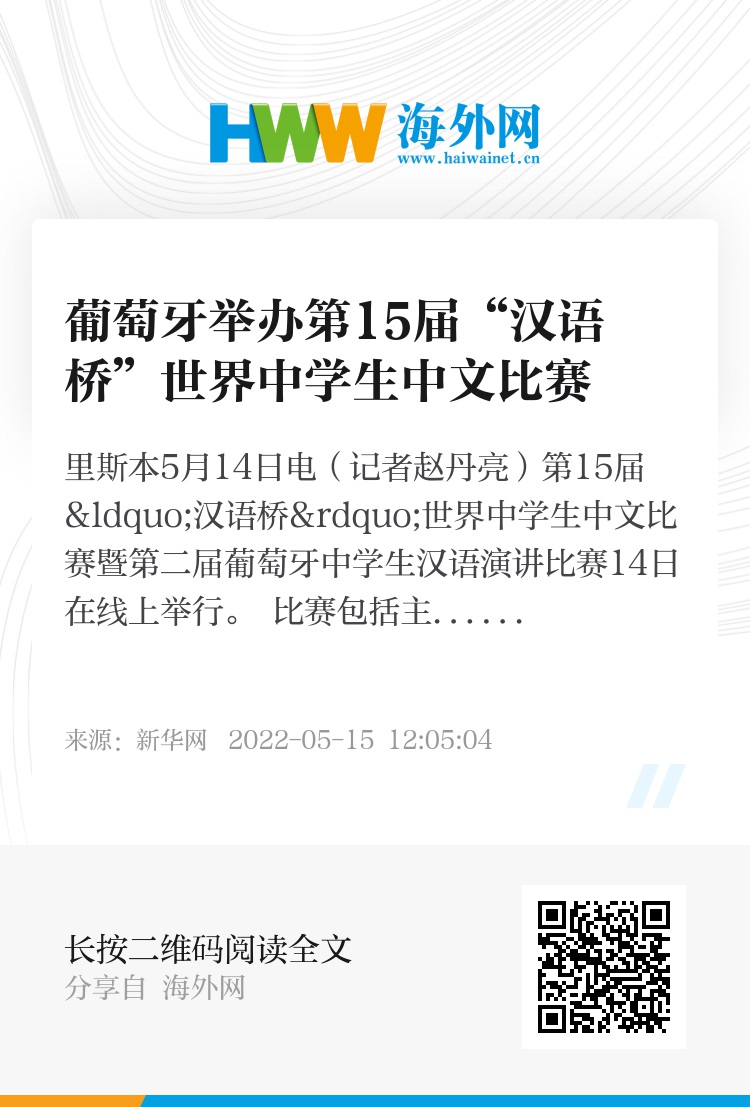 新华社里斯本5月14日电(记者赵丹亮)第15届“汉语桥”世界中学生中文比赛暨第二届葡萄牙中学生汉语演讲比赛14日在线上举行。