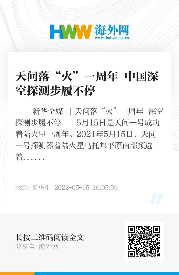5月15日是天问一号成功着陆火星一周年。2021年5月15日,天问一号探测器着陆火星乌托邦平原南部预选着陆区,我国首次火星探测任务着陆火星成功,标志着我国迈出了星际探测征程的重要一步,实现了从地月系到行星际的跨越,在火星上首次留下中国人的印迹。
