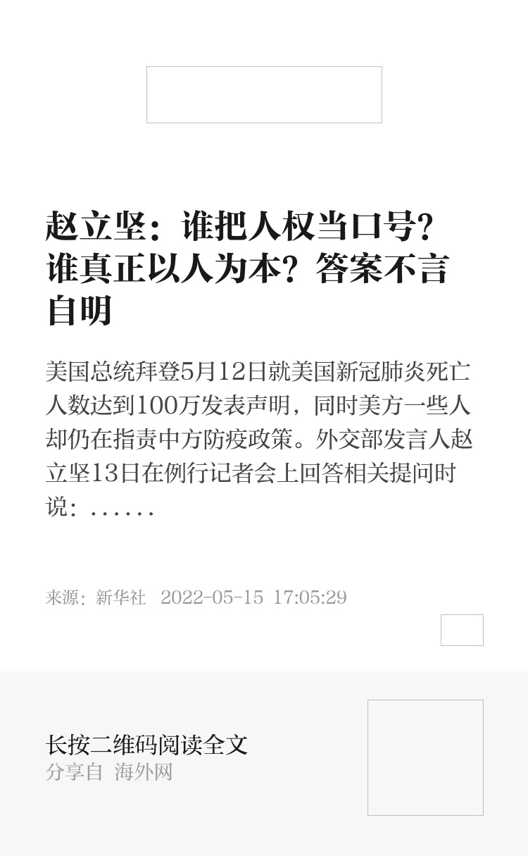 美国总统拜登5月12日就美国新冠肺炎死亡人数达到100万发表声明,同时美方一些人却仍在指责中方防疫政策。外交部发言人赵立坚13日在例行记者会上回答相关提问时说:“首先我想对这100万不幸逝去生命表示深切哀悼。美国国家大教堂敲响了1000下钟声,这钟声既是纪念哀悼,也是警醒拷问。疫情面前,资本和人命孰轻孰重?政治优先还是生命优先?到底是谁把人权当口号、谁才真正以人为本?答案不言自明。”