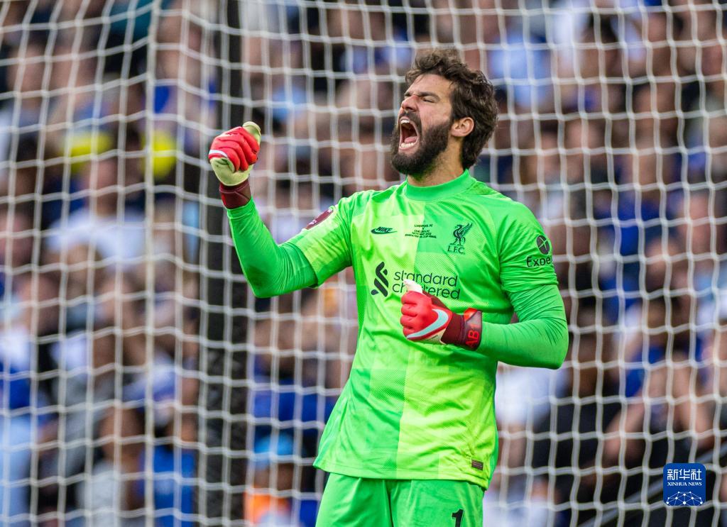 5月14日,在切尔西队球员阿斯皮利奎塔射丢点球后,利物浦队门将阿利松庆祝球队在点球大战中领先。