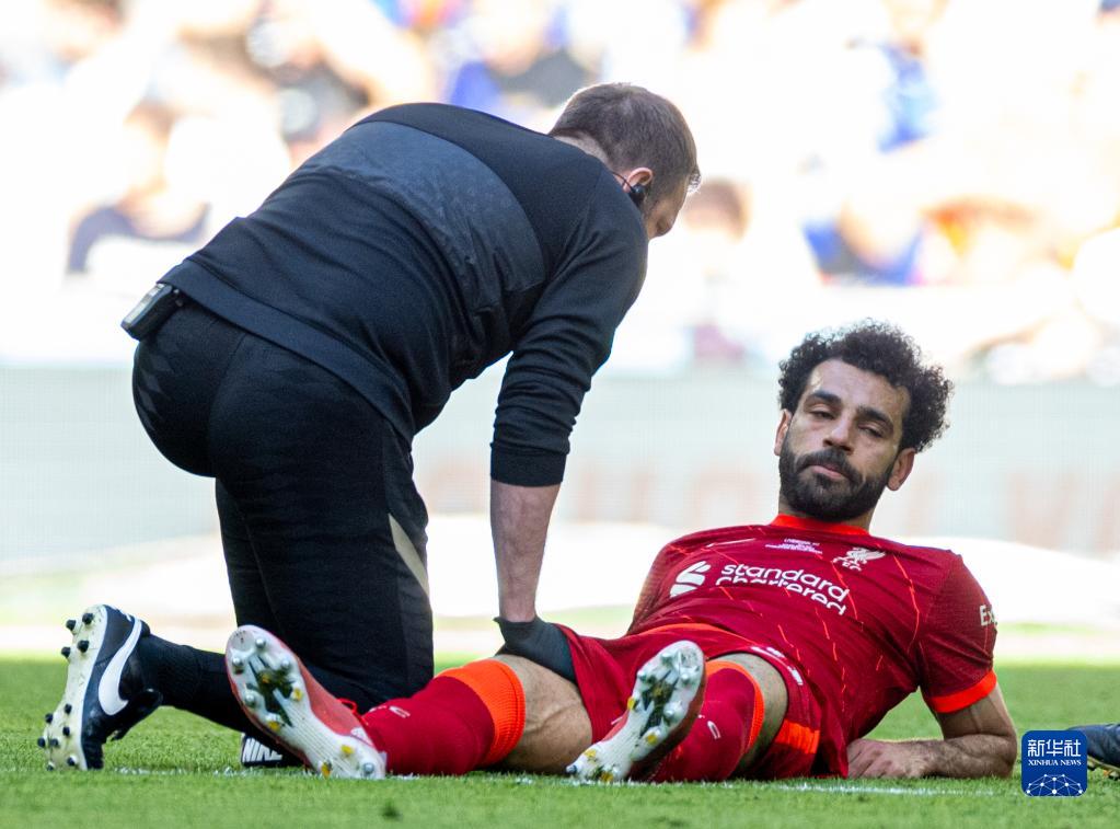 5月14日,利物浦队球员萨拉赫(右)在受伤后接受治疗。