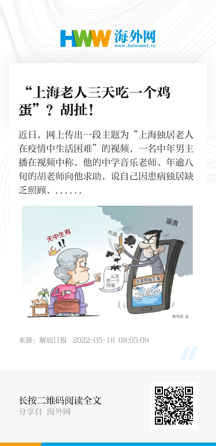 近日,网上传出一段主题为“上海独居老人在疫情中生活困难”的视频,一名中年男主播在视频中称,他的中学音乐老师、年逾八旬的胡老师向他求助,说自己因患病独居缺乏照顾,结果疫情发生后,“三天吃一个鸡蛋,几次想自杀”。该男主播称其主动帮助胡老师联系了开餐厅的朋友,送去餐食。很多网友牵挂视频中的独居老人,相关部门也很重视,根据视频提供的线索进行排查,却发现事实并非如此。5月14日,视频当事人胡老师现身,明确表示视频所说并非事实,她与中年男主播并不相熟,不存在向其求助的情况。对于网友关心她的生活现状,胡老师澄清:“居委会和志愿者对我的照顾无微不至,却被人借疫情发挥,抹黑政府。”