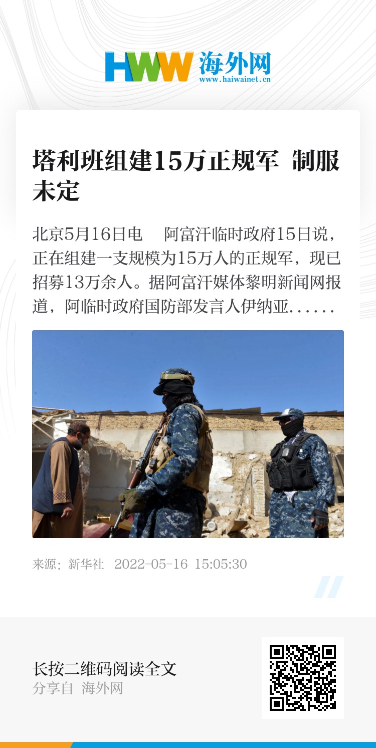 据阿富汗媒体黎明新闻网报道,阿临时政府国防部发言人伊纳亚图拉·哈瓦拉扎米说:“超过13万人已经登记(应征),这一进程将继续。征召完成后,阿富汗人将看到一支独立、合格且忠诚的军队,它会提供安全保障,保卫阿富汗的领土和边界。”