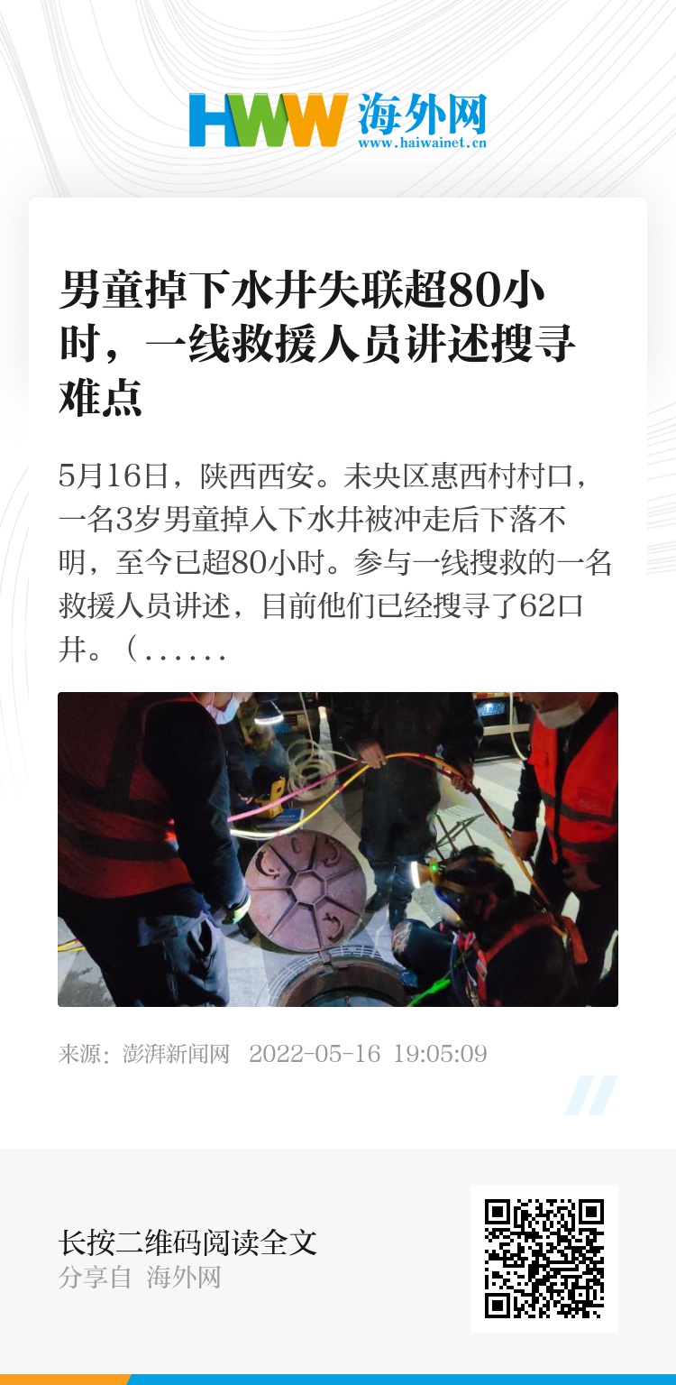 5月16日,陕西西安。未央区惠西村村口,一名3岁男童掉入下水井被冲走后下落不明,至今已超80小时。参与一线搜救的一名救援人员讲述,目前他们已经搜寻了62口井。(澎湃新闻记者:卫佳明)