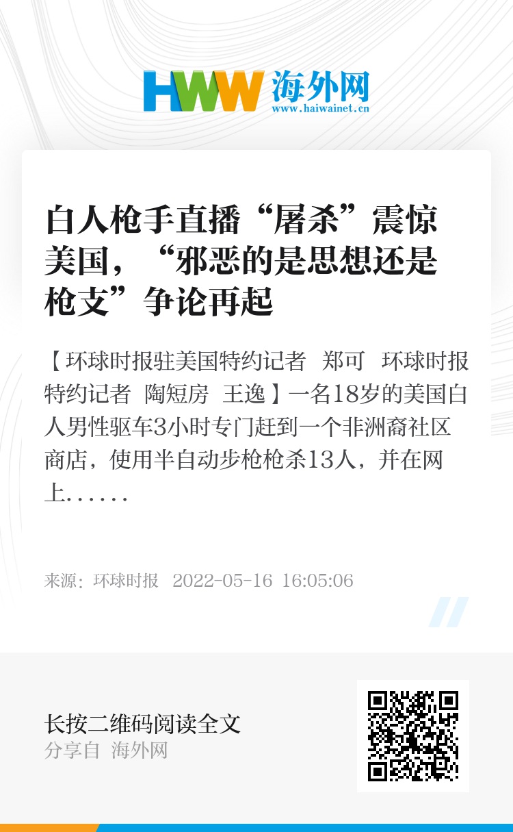 【环球时报驻美国特约记者 郑可 环球时报特约记者 陶短房 王逸】一名18岁的美国白人男性驱车3小时专门赶到一个非洲裔社区商店,使用半自动步枪枪杀13人,并在网上直播这场“屠杀”……14日发生在纽约州布法罗市的这起枪击案震惊了美国。这是今年迄今为止美国发生的最严重枪击案。美国司法部迅速将此案定为“仇恨犯罪和出于种族动机的暴力极端主义”。总统拜登要求彻查,并表示美国“没有仇恨的避风港”。与此同时,据称是枪手留下的180页“白人至上主义宣言”被媒体和专家仔细解读,其信仰与西方近年来发生的多起白人至上主义犯罪如出一辙。14日,美国多名议员发声谴责仇恨犯罪,并要求管控枪支暴力。“邪恶的是思想还是枪支”的争论再次燃起。