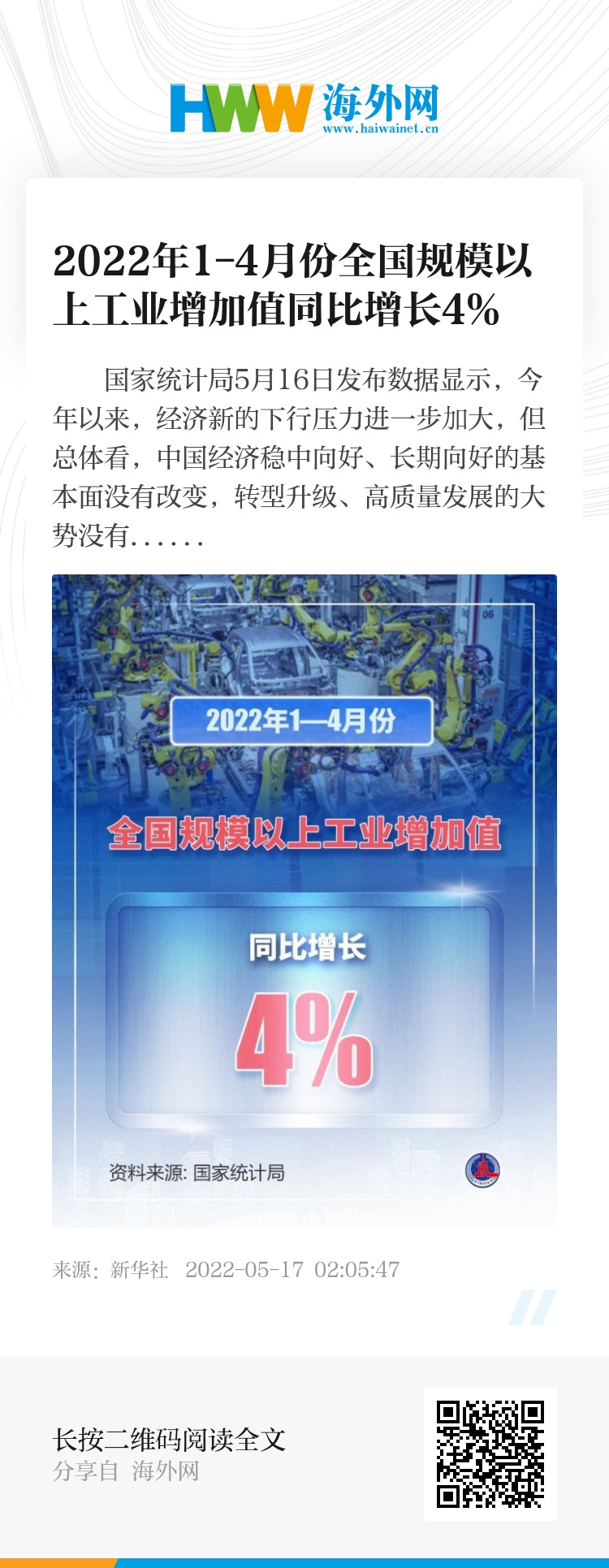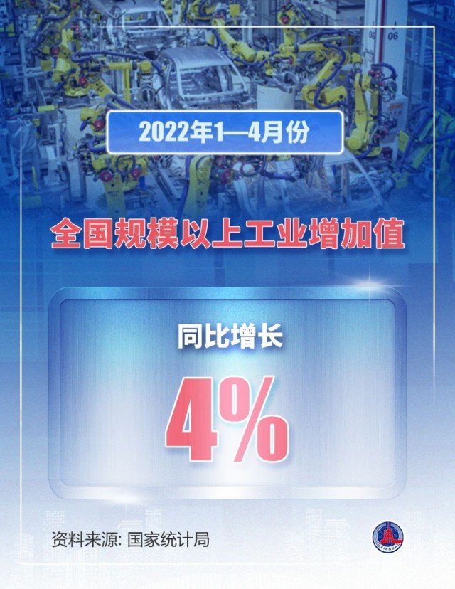 国家统计局5月16日发布数据显示,今年以来,经济新的下行压力进一步加大,但总体看,中国经济稳中向好、长期向好的基本面没有改变,转型升级、高质量发展的大势没有改变。1至4月份,全国规模以上工业增加值同比增长4%,全国固定资产投资同比增长6.8%。