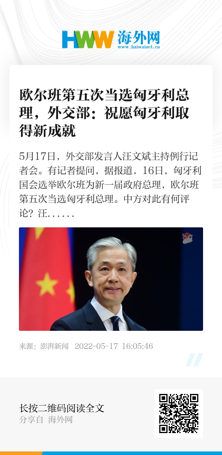5月17日,外交部发言人汪文斌主持例行记者会。有记者提问,据报道,16日,匈牙利国会选举欧尔班为新一届政府总理,欧尔班第五次当选匈牙利总理。中方对此有何评论?