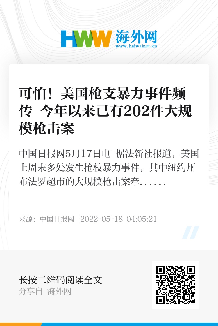 中国日报网5月17日电 据法新社报道,美国上周末多处发生枪枝暴力事件,其中纽约州布法罗超市的大规模枪击案牵涉种族主义仇恨犯罪,成为焦点。这起大规模枪击登上媒体头条,其他地方的较小型事件更显示,公众枪击案在美国似乎已成日常。