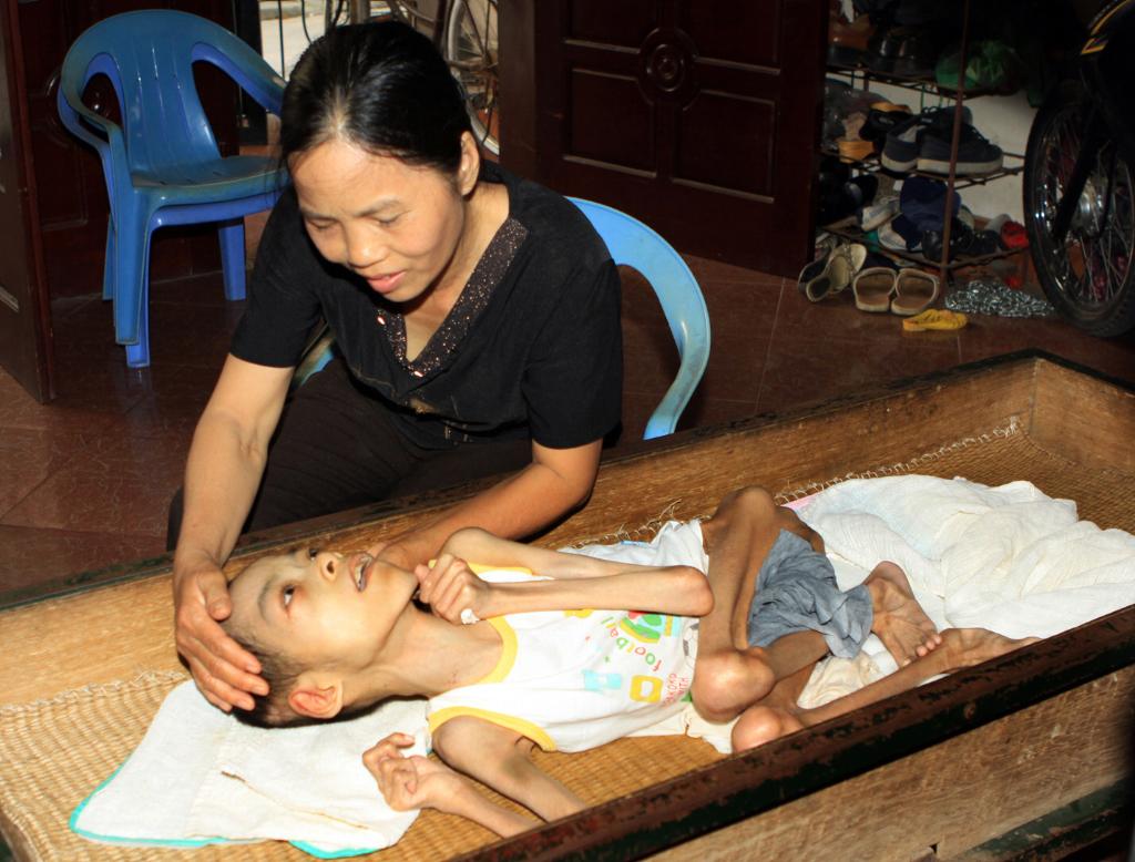 2012年11月1日,在越南清化省,一名母亲在安抚因“橙剂”污染导致残疾的儿子。“橙剂”是越战时美军使用的一种高效落叶剂,所含化学成分二恶英可引发癌症、新生儿缺陷和其他疾病。新华社/越通社