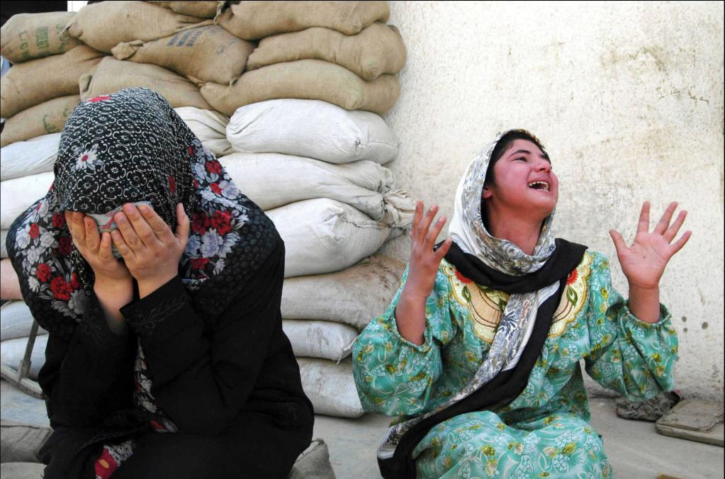 2003年4月11日,两名伊拉克妇女坐在巴格达街头为在战争中死去的亲人失声痛哭。新华社特约摄影师若巴尔摄
