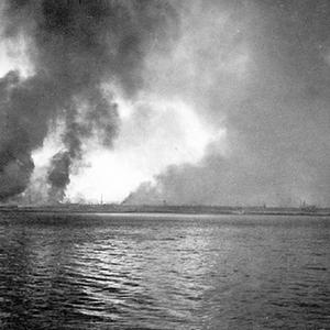 1950年10月初,侵略军悍然越过三八线,并把战火烧到中国边境。图为安东市(今辽宁省丹东市)对岸朝鲜新义州在浓烟烈火中。新华社发(杨振亚摄)