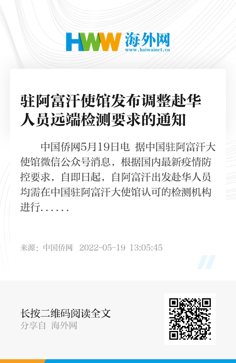 中国侨网5月19日电 据中国驻阿富汗大使馆微信公众号消息,根据国内最新疫情防控要求,自即日起,自阿富汗出发赴华人员均需在中国驻阿富汗大使馆认可的检测机构进行“双核酸检测”,不再进行“核酸抗体双检测”。具体如下: