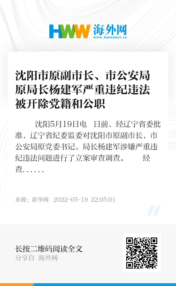 新华社沈阳5月19日电 日前,经辽宁省委批准,辽宁省纪委监委对沈阳市原副市长,市公安局原党委书记、局长杨建军涉嫌严重违纪违法问题进行了立案审查调查。