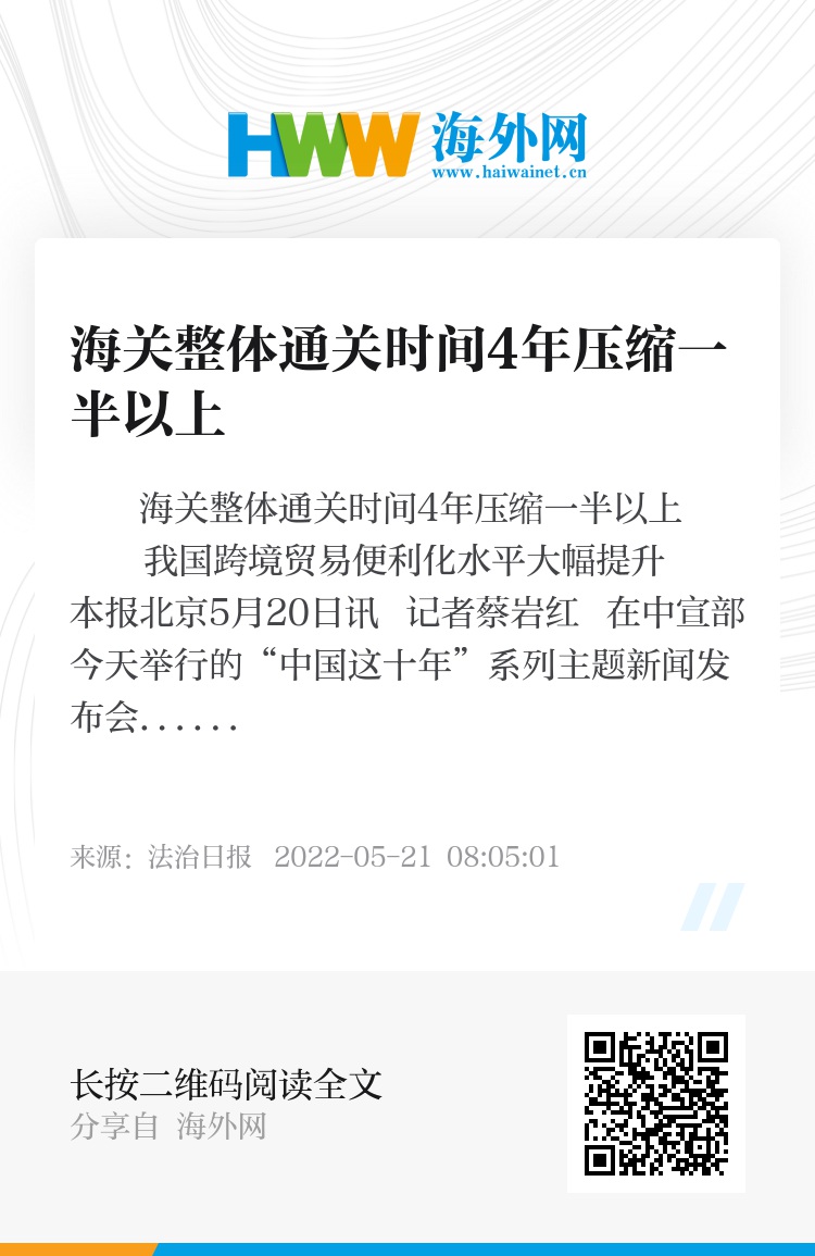开展跨境贸易便利化专项行动。压时间、减单证、降成本,打造市场化法治化国际化口岸营商环境。2021年,我国进口整体通关时间32.97小时,相比2017年压缩了60%以上;出口1.23小时,相比2017年压缩80%以上。