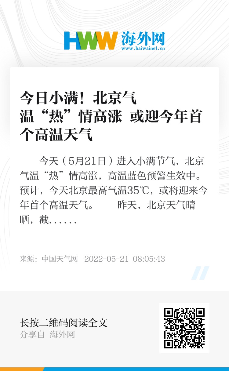 今天(5月21日)进入小满节气,北京气温“热”情高涨,高温蓝色预警生效中。预计,今天北京最高气温35℃,或将迎来今年首个高温天气。