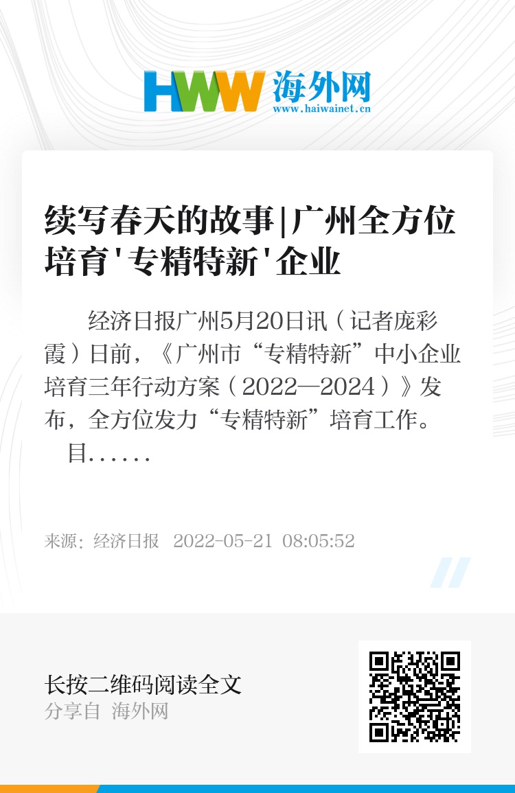 经济日报广州5月20日讯(记者庞彩霞)日前,《广州市“专精特新”中小企业培育三年行动方案(2022—2024)》发布,全方位发力“专精特新”培育工作。