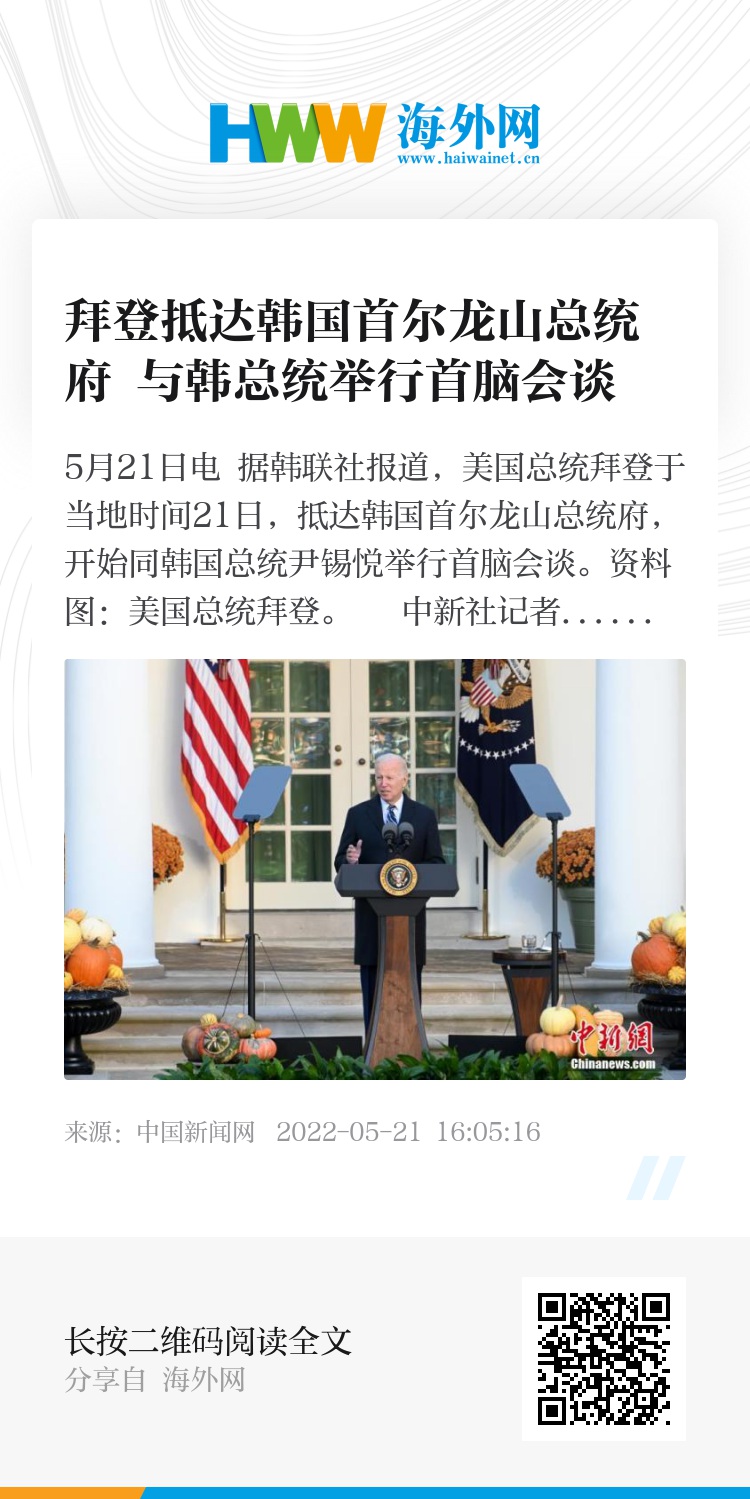 中新网5月21日电 据韩联社报道,美国总统拜登于当地时间21日,抵达韩国首尔龙山总统府,开始同韩国总统尹锡悦举行首脑会谈。