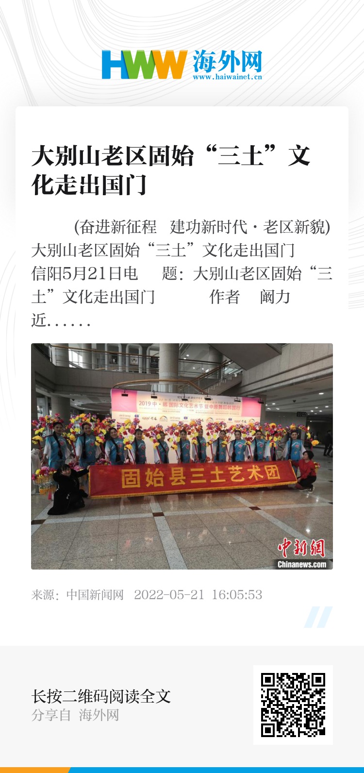 中新网信阳5月21日电 题:大别山老区固始“三土”文化走出国门