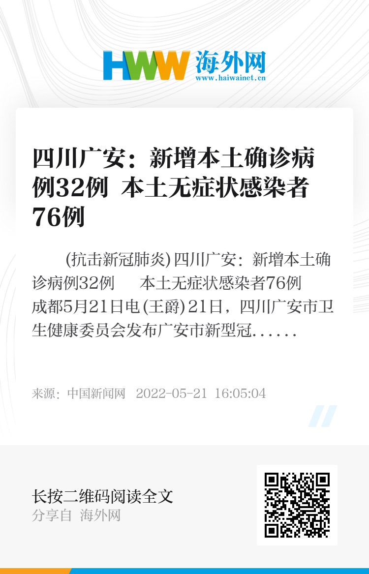 中新网成都5月21日电(王爵)21日,四川广安市卫生健康委员会发布广安市新型冠状病毒肺炎疫情最新情况。