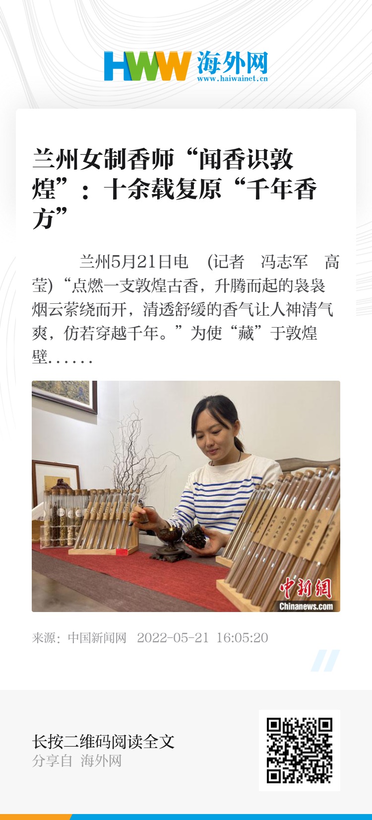 中新网兰州5月21日电 (记者 冯志军 高莹)“点燃一支敦煌古香,升腾而起的袅袅烟云萦绕而开,清透舒缓的香气让人神清气爽,仿若穿越千年。”为使“藏”于敦煌壁画和文献里的千年古香,在现代中生活飘香,兰州制香师鲁雯十余年频繁前往敦煌寻找“香方”,通过与专家沟通和搜寻敦煌文献等史料记载,每年都有五六款敦煌古香被复原。