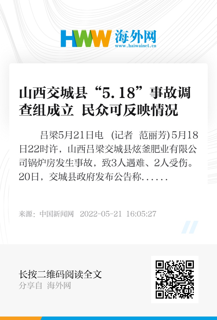 中新网吕梁5月21日电 (记者 范丽芳)5月18日22时许,山西吕梁交城县炫釜肥业有限公司锅炉房发生事故,致3人遇难、2人受伤。20日,交城县政府发布公告称,经山西省政府批准成立调查组,对交城县“5.18”事故进行调查。