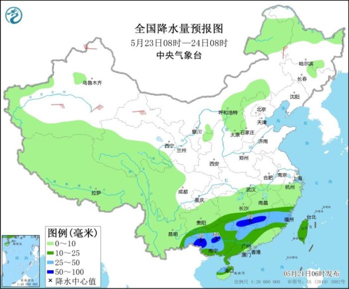 5月23日08时至24日08时,川西高原、青海中南部、西藏有小雨或阵雨,高海拔地区有小到中雪或雨夹雪;江南南部、华南大部、贵州南部、云南东部、台湾岛等地部分地区有中到大雨,其中,湖南南部、江西南部、广西中西部等地部分地区有暴雨(50~70毫米)。内蒙古中东部、黑龙江西部、新疆北疆北部和南疆盆地、甘肃北部等地部分地区有4~6级风,其中,新疆南疆盆地、甘肃北部等地部分地区有6~7级风。