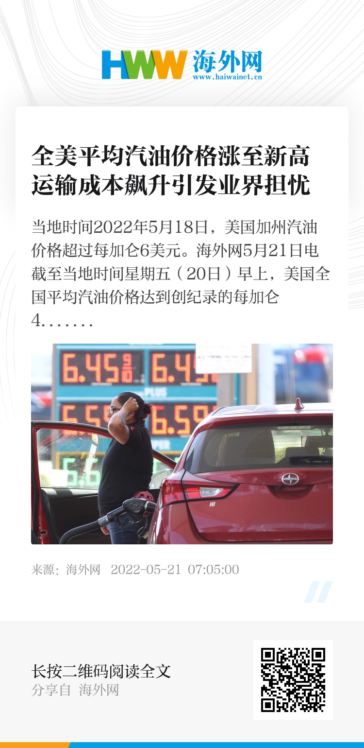 海外网5月21日电 截至当地时间星期五(20日)早上,美国全国平均汽油价格达到创纪录的每加仑4.593美元;随着运输成本的飙升,美国业界担忧某些地区及行业或由此实施配给制度。
