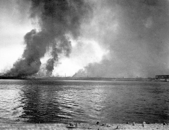 1950年10月初,侵略军悍然越过三八线,并把战火烧到中国边境。图为安东市(今辽宁省丹东市)对岸朝鲜新义州在浓烟烈火中。新华社发(杨振亚摄)