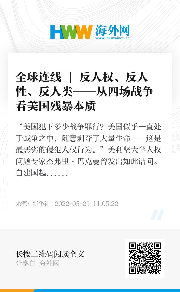 自建国起,美国就热衷于武力扩张。二战结束后,美国更是野心膨胀,为争夺和维护霸权频频在世界各地挑起或参与战争,造成大量无辜平民死伤,无数人流离失所。可以说,从朝鲜战争、越南战争,到伊拉克战争、阿富汗战争,美国打着维护“民主、自由、人权”的旗号,制造了一连串震惊世界的惨案,犯下了一系列反人权、反人性、反人类的罪行。