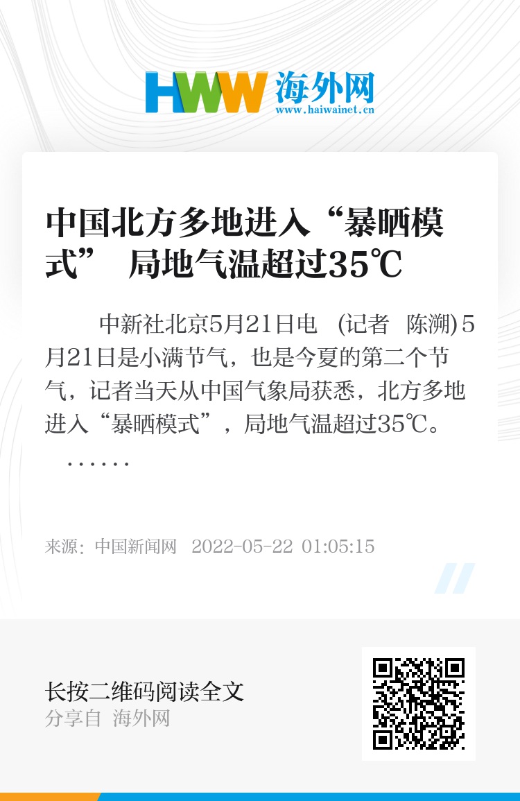 中新社北京5月21日电 (记者 陈溯)5月21日是小满节气,也是今夏的第二个节气,记者当天从中国气象局获悉,北方多地进入“暴晒模式”,局地气温超过35℃。