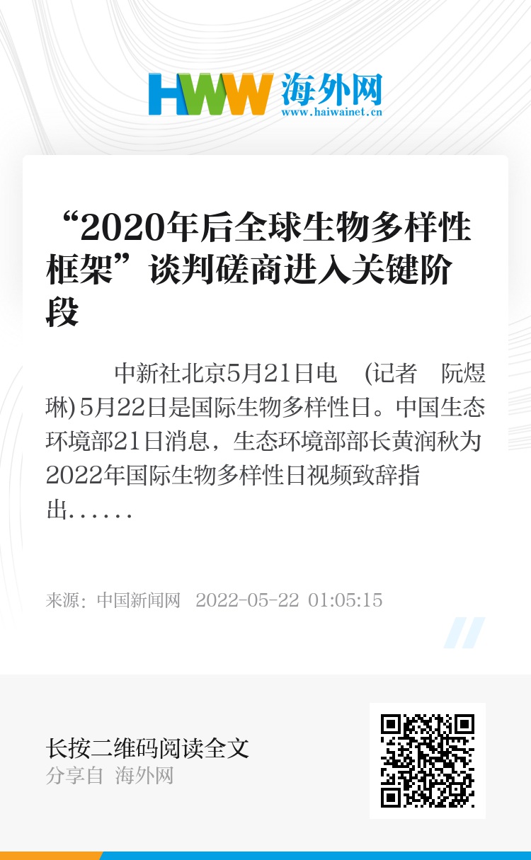 中新社北京5月21日电 (记者 阮煜琳)5月22日是国际生物多样性日。中国生态环境部21日消息,生态环境部部长黄润秋为2022年国际生物多样性日视频致辞指出,当前,“2020年后全球生物多样性框架”谈判磋商已经到了关键阶段,中国呼吁国际社会继续携手并进,共同推动关键议题尽快达成。