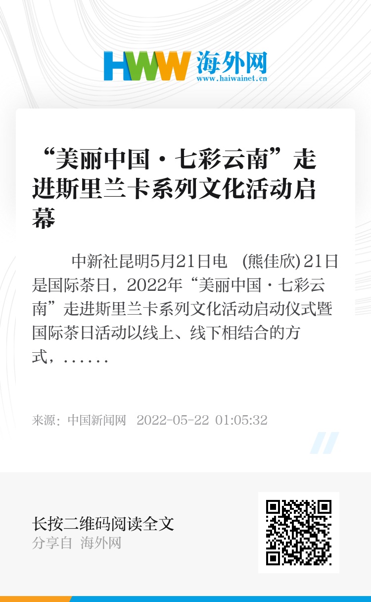 据悉,2022年“美丽中国·七彩云南”走进斯里兰卡系列文化活动将在“云端”持续至7月31日,山海红茶馆——创意好茶线上短视频推介展播、跨越喜马拉雅的握手——带着香茶走“一带一路”线上主题展等活动将相继举办。(完)