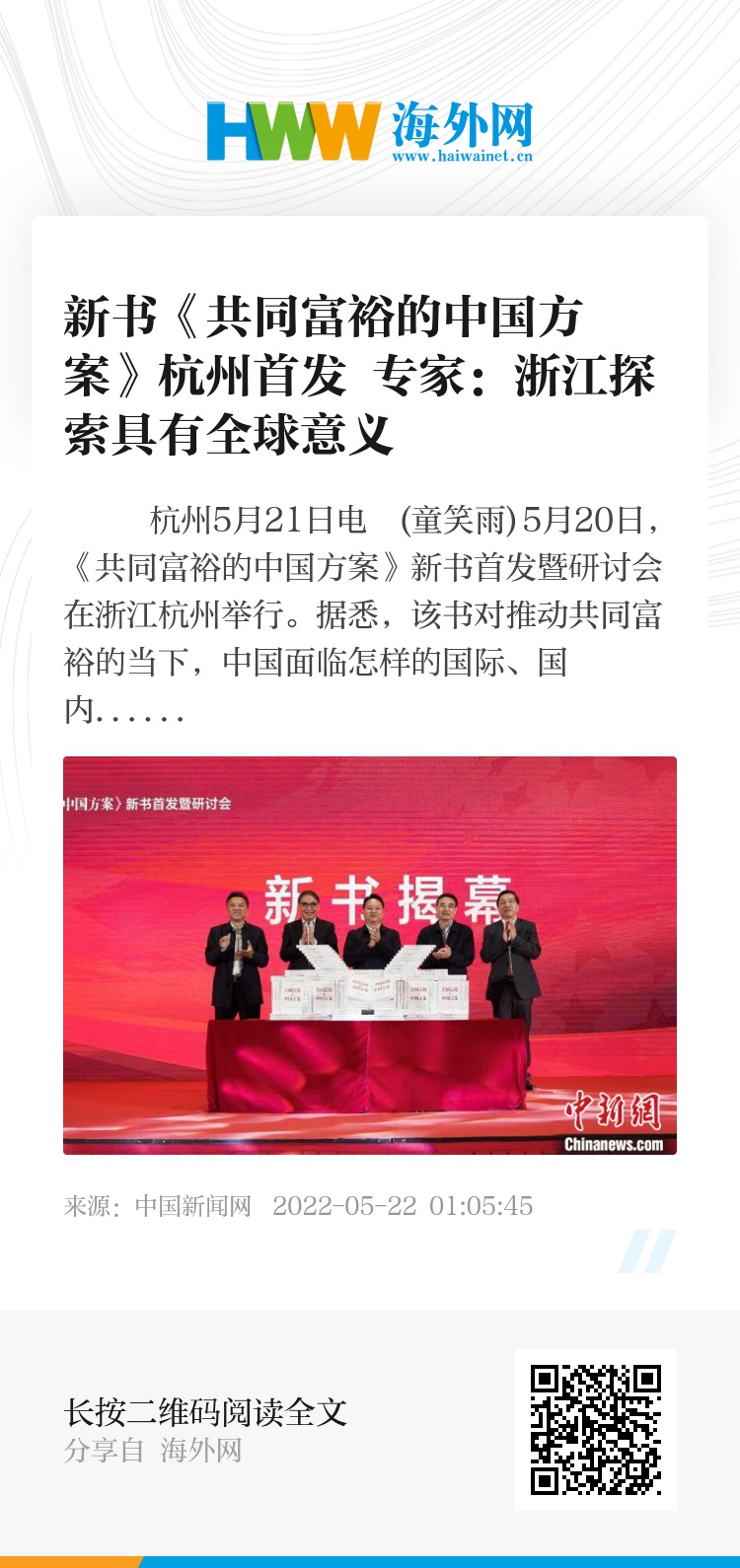 据悉,《共同富裕的中国方案》由著名学者、浙江省委高质量发展建设共同富裕示范区咨询委委员郑永年撰写,由浙江人民出版社出版。
