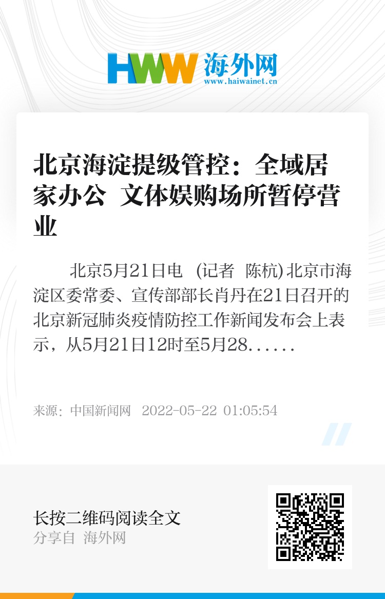 中新网北京5月21日电 (记者 陈杭)北京市海淀区委常委、宣传部部长肖丹在21日召开的北京新冠肺炎疫情防控工作新闻发布会上表示,从5月21日12时至5月28日12时,海淀区全域实行提级管控措施,区域内单位全面实行居家办公,各大商圈、商场、购物中心(除超市、取消堂食的餐饮机构、食品店外)暂停营业。
